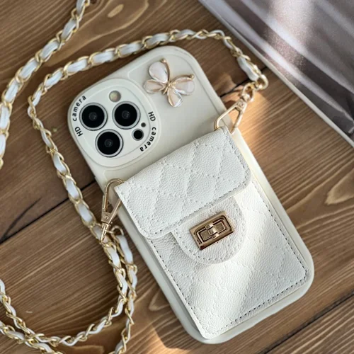 قاب موبایل آیفون بند زنجیری بلند بالشتی پروانه ای جاکارتی دار