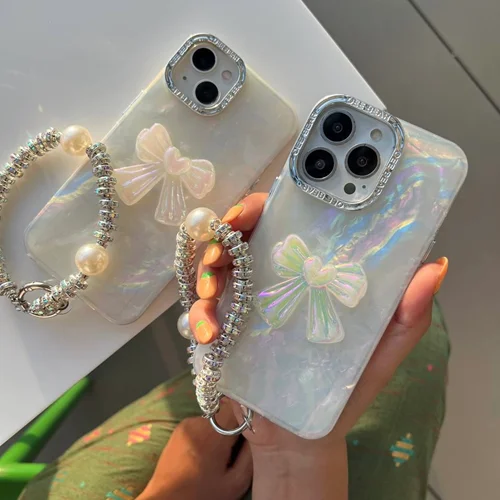 قاب موبایل آیفون پاپیون صدفی همراه با آویز مرواریدی