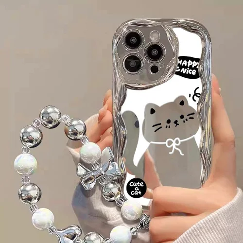 قاب موبایل سامسونگ silver cat ایینه ای همراه با اویز دستی