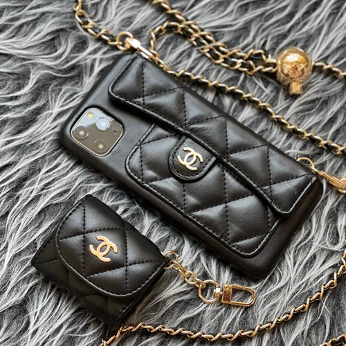 قاب گوشی آیفون شنل بالشتی جا کارتی دار + بند طلایی زنجیری ست