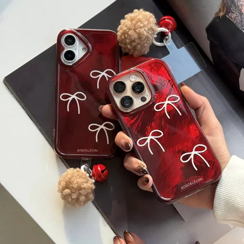 قاب گوشی آیفون چری پاپیونی همراه با آویز زنگوله ای