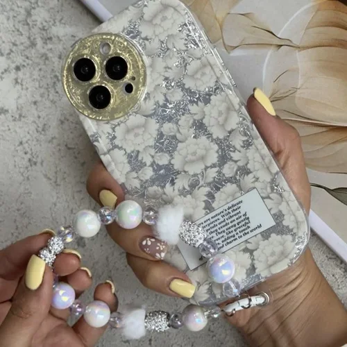 کاور آیفون گل مستر پیس سفید نقره ای + بندست مخملی