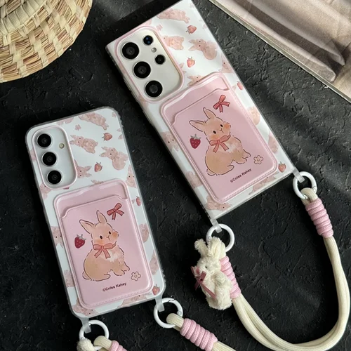 خانه قاب گوشی سامسونگ قاب گوشی S23 FE کاور موبایل سامسونگ خرگوش توت فرنگی پاپیون آویز و بند عروسکی